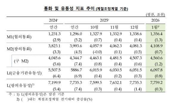 한국은행이 13일 발표한 '통화 및 유동성' 통계에 따르면 1월 평균 광의 통화량(M2 기준·평잔)은 4108조 9000억원으로 전월보다 0.7% 증가했다.