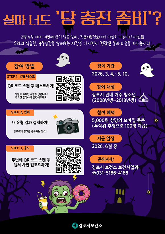 캠페인 참여 대상은 김포시에 거주하는 2008년생부터 2013년생까지의 청소년이다. 참여 방법은 스마트폰을 통해 전용 링크(https://smore.im/quiz/2461OK3rGu) 또는 QR코드에 접속해 8가지 질문에 답변하면 된다. 답변 결과에 따라 개인의 식습관 유형이 캐릭터로 제시되며, 참가자는 자신의 생활 습관을 재미있게 진단해 볼 수 있다.