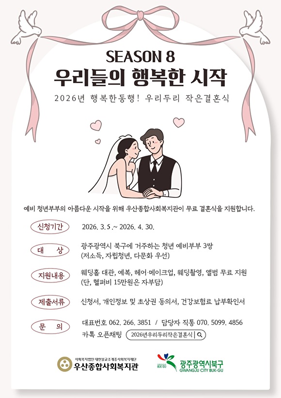 [아이뉴스24 김상진 기자] 광주시 북구에서 청년 예비부부를 대상으로 내달 30일까지 ‘우리두리 작은 결혼식’ 참여자를 모집한다고 16일 밝혔다.
