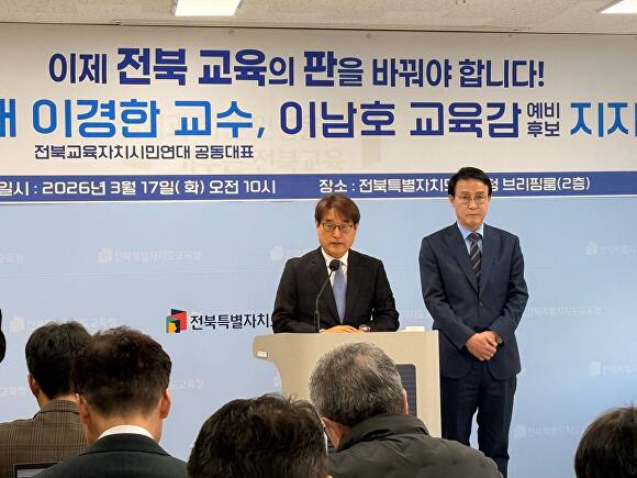 이 교수는 17일 전북교육청 브리핑룸에서 기자회견을 갖고 “전북교육의 대새적 가치가 ‘미래’로 바뀌었다”며 “이남호 예비후보는 이러한 시대적 전환 속에서 전북교육이 나아갈 방향을 설계하고 실천할 적임자”라고 지지 이유를 밝혔다.