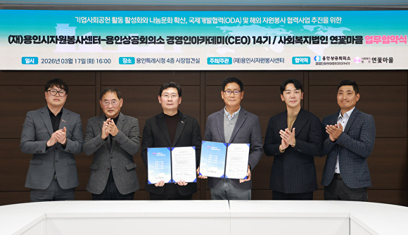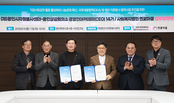 협약식에는 용인시자원봉사센터 이사장인 이상일 시장을 비롯해 구성회 용인상공회의소 경영인 아카데미(CEO) 14기 회장과 임원진, 조당호 사회복지법인 연꽃마을 대표이사, 김기태 처인노인복지관 관장 등이 참석했다.