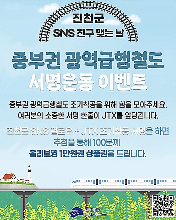 [아이뉴스24 안영록 기자] 충북 진천군은 ‘중부권 광역급행철도(JTX)’ 조기 착공을 위해 오는 29일까지 SNS(사회관계망서비스) 서명운동 참여 이벤트를 한다고 18일 밝혔다.