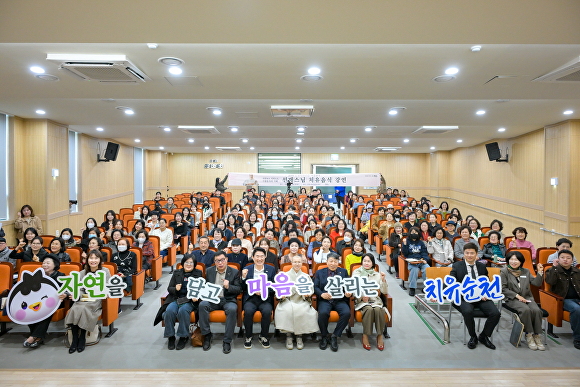 지난 17일 전남 순천시에서 진행된 선재스님 강연에서 선재스님과 참석자들이 '자연을 담고 마음을 살리는 치유순천' 패널을 들고 있다. [사진=순천시]
