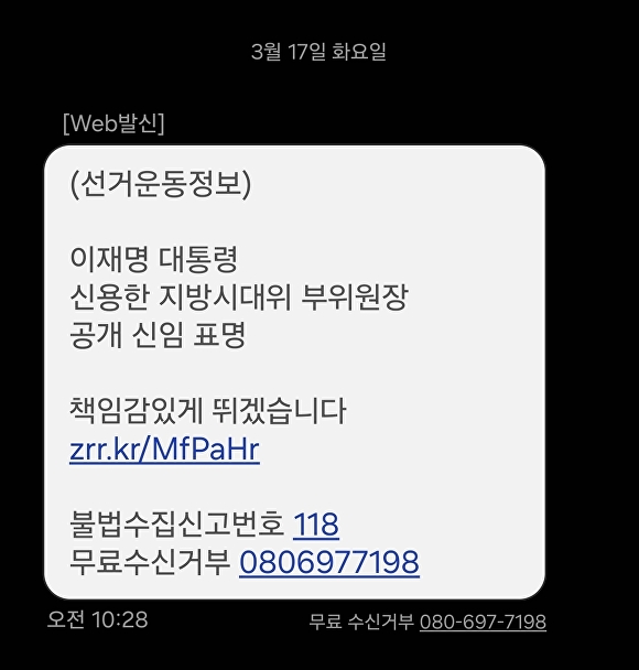 이 문자메시지에는 모 언론사의 기사 인터넷주소 링크가 첨부돼 있다.