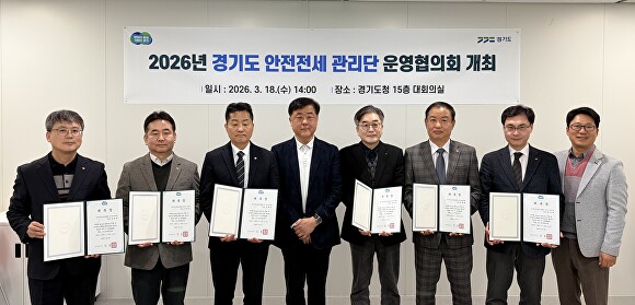 18일 경기도청에서 열린 2026년 경기도 안전전세 관리단 운영협의회 후 회장단이 기념촬영하고 있다. [사진=경기도]
