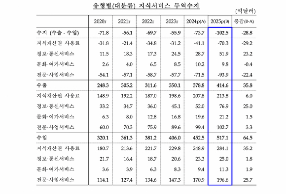 19일 한국은행의 '지식서비스 무역통계(잠정)'에 따르면 지난해 지식서비스 무역수지는 수출이 414억 6000만달러, 수입은 517억 1000만달러로 전년 대비 적자 폭이 확대했다.