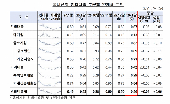 [아이뉴스24 신수정 기자] 지난 1월 말 은행의 원화 대출 연체율이 0.56%로 전월 말보다 0.06%포인트(p) 상승했다. 전년 동월 대비로는 0.03%p 상승했다.