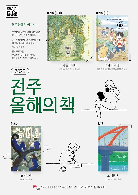 시는 시민들과 함께 읽을 ‘2026 전주 올해의 책’으로 △어린이(그림) 부문 황금 고라니(김민우 글·그림, 노란상상) △어린이(글) 부문 거의 다 왔어!(윤일호 글·정지윤 그림, 내일을여는책) △청소년 부문 늪지의 렌(최상희 저, 창비) △일반 부문 노 피플 존(정이현 저, 문학동네) 총 4권을 선정했다고 19일 밝혔다.