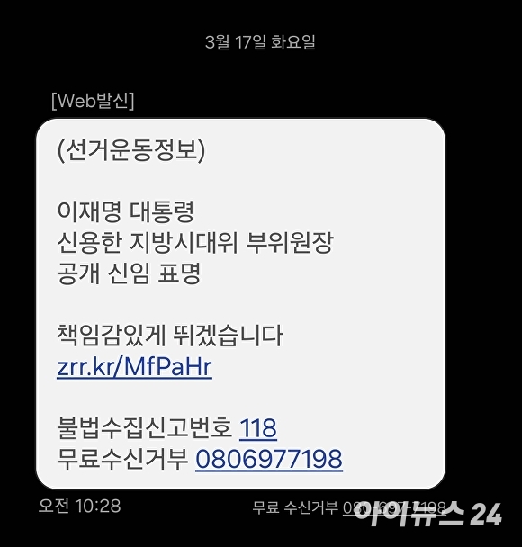더불어민주당 신용한 충북도지사 예비후보 명의로 발송된 문자메시지 갈무리. [사진=아이뉴스24 DB]