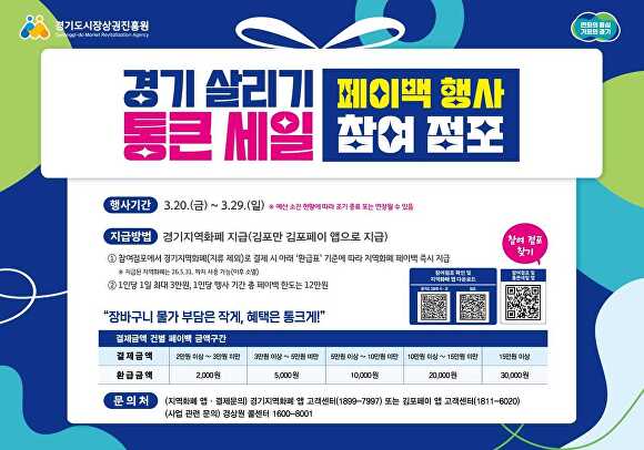 행사 기간 참여 점포에서 경기지역화폐(지류 제외)로 결제하면 금액 구간에 따라 즉시 페이백이 지급된다. 2만-3만원 미만은 2,000원, 3만-5만원 미만은 5,000원, 5만-10만원 미만은 1만원, 10만-15만원 미만은 2만원, 15만원 이상은 3만원이 환급된다. 환급 한도는 1인당 하루 최대 3만원, 행사 기간 총 12만원까지다. 지급된 지역화폐는 오는 5월 31일까지 사용할 수 있으며 이후 소멸된다.
