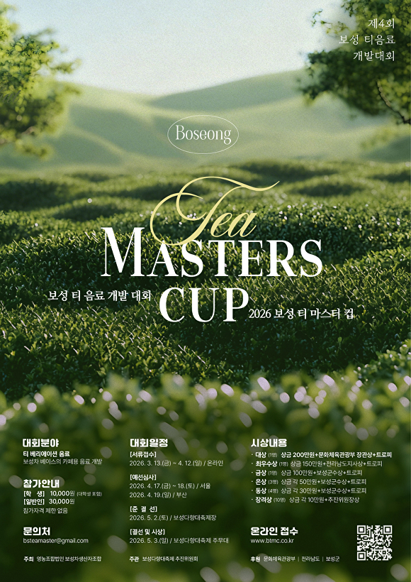 ‘보성 티 마스터컵’은 보성차를 기반으로 창의적인 차 음료를 개발하는 국내 최대 규모 차(茶) 음료 개발 경연대회로, 전국 차 전문가와 바리스타, 음료 전공 학생 등이 참여해 차 음료 경향을 제시하는 행사다.