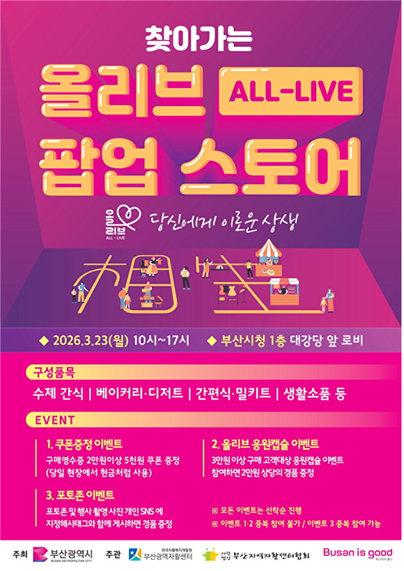 아울러 시는 23일 오전 10시부터 오후 5시까지 시청 1층에서 자활생산품 판로 확대를 위한 ‘찾아가는 올리브 팝업스토어’를 처음 개최해 시민들에게 수제청 등 다양한 제품을 최대 20% 할인 판매한다.