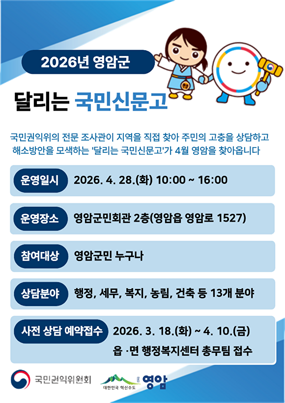 이번 국민신문고는 내달 28일 오전 10시부터 오후 4시까지 영암군민회관에서 열린다. 국민권익위원회 전문 조사관이 직접 현장을 찾아 행정·복지뿐 아니라 생활법률, 서민금융 등 다양한 분야의 민원을 상담한다.