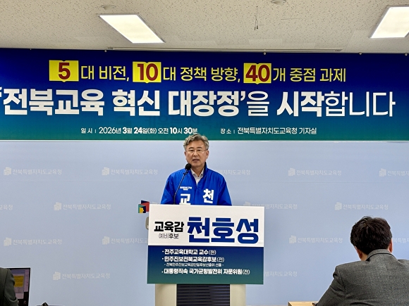 [아이뉴스24 박종수 기자] 천호성 전북교육감 예비후보가 24일부터 도민과 함께 하는 '전북교육 혁신 70일 대장정'에 나선다.