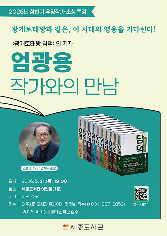 [아이뉴스24 임정규 기자] 경기도 여주시는 오는 5월 21일 오후 7시 세종도서관에서 대하소설 '광개토태왕 담덕'의 저자 엄광용 작가를 초청해 ‘작가와의 만남’ 행사를 운영한다고 24일 밝혔다.