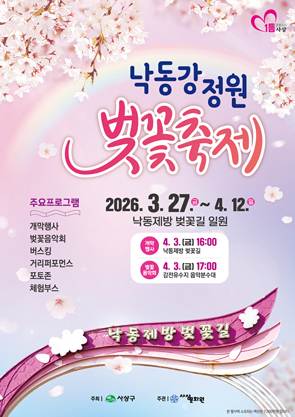 조병길 사상구청장은 "2026년 낙동강정원 벚꽃축제에 삼락생태공원의 국가정원 지정 염원을 담았다"며 "많은 시민이 아름다운 벚꽃과 함께 삼락생태공원의 봄 정취를 만끽하시길 바란다"고 밝혔다.