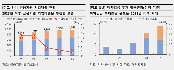 26일 한은의 '금융안정 상황'에 따르면 2023년 이후 기업 자금조달은 전반적으로 부진한 흐름을 이어갔다. 기업 대출 증가율은 2021~2022년 13.4%에서 2025년 2.2%로 크게 낮아졌다.
