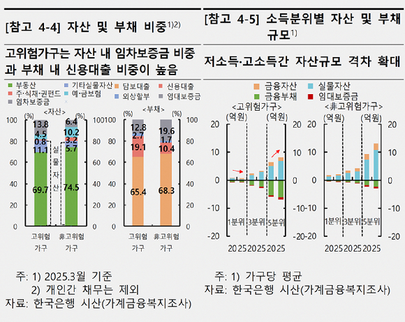 26일 한국은행의 '금융안정 상황'에 따르면 2025년 기준 고위험 가구의 평균 총자산은 2억 7000만원으로 비 고위험 가구(6억 4000만원)의 절반에도 미치지 못했다.