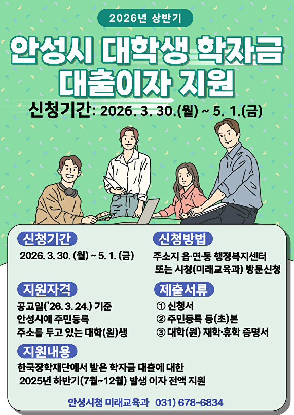 [아이뉴스24 임정규 기자] 경기도 안성시는 대학생·대학원생의 교육비 부담을 덜어주기 위해 '2026년 상반기 대학생 학자금 대출이자 지원사업'을 시행한다고 25일 밝혔다.