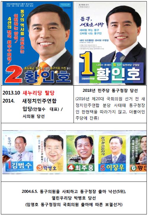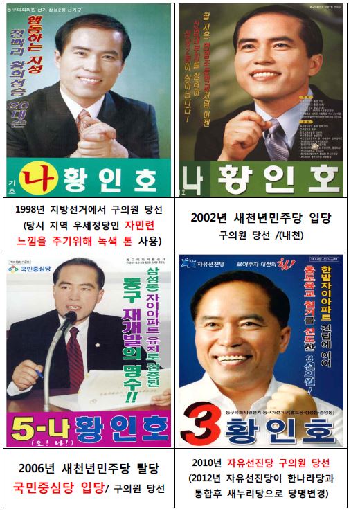 더 아이러니한 것은 따로 있다. 황인호 후보 본인의 정치 이력이다. 그는 정치 인생 동안 국민중심당, 새누리당, 자유선진당 등 다섯 차례 이상의 당적 변경을 거쳤다. 한때 안철수 지지 선언에 앞장서기까지 했다. 이 때문에 지역 유권자에게 매 선거마다 “정치적 저울질”이라는 인상을 남겨왔다.