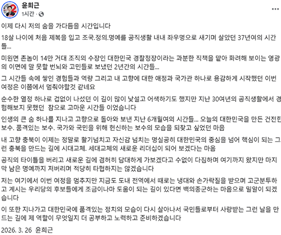 윤 전 청장은 26일 늦은 오후 페이스북을 통해 “고향에 대한 애정과 국가관 하나로 용감하게 시작했던 이번 여정은 이쯤에서 멈춰야할것 같네요”라며 경선 불참을 선언했다.