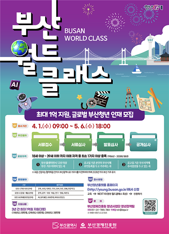 [아이뉴스24 정예진 기자] 부산광역시와 부산경제진흥원이 내달 1일부터 오는 5월 6일까지 성장 잠재력과 역량을 갖춘 지역 청년 인재를 발굴해 세계적인 인재로 육성하기 위한 ‘2026년 청년 월드클래스 육성 사업’의 참여자를 모집한다.