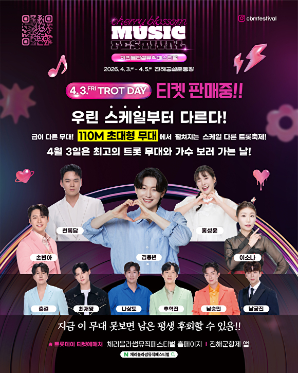[아이뉴스24 박채오 기자] 대한민국 대표 봄꽃 축제인 '진해군항제' 기간 중인 내달 3일부터 5일까지 경남 창원 진해 공설운동장에서 벚꽃과 음악이 하나 되는 '2026 체리블라썸뮤직페스티벌(Cherry Blossom Music Festival)'이 펼쳐진다.