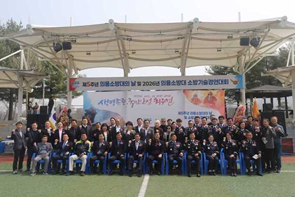 김영복 서장이 제5주년 의용소방대의날 및 2026년 의용소방대 소방기술경연대회를 마치고 기념 촬영을 하고 있다. [사진=여주소방서]