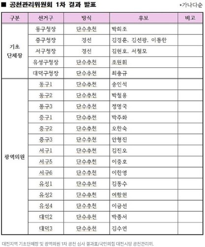 광역의원 1차 공천에서는 총 14명이 단수 추천으로 확정됐다. 동구는 송인석·박철용·정명국, 중구는 박주화·오한숙·안형진, 서구는 김진오·이중호·이한영, 유성구는 김동수·여황현·이금선, 대덕구는 박종서·김수연 후보가 각각 공천을 받았다.