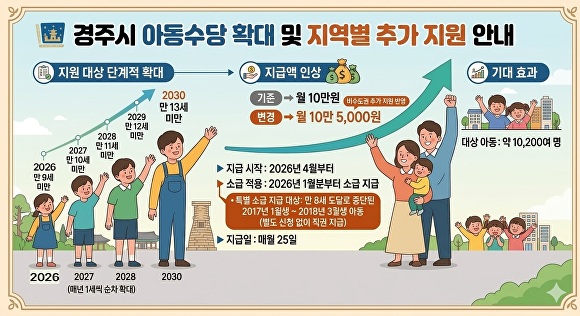[아이뉴스24 이진우 기자] 경북 경주시는 저출생 대응과 양육비 부담 완화를 위해 아동수당 지원을 확대한다고 29일 밝혔다.