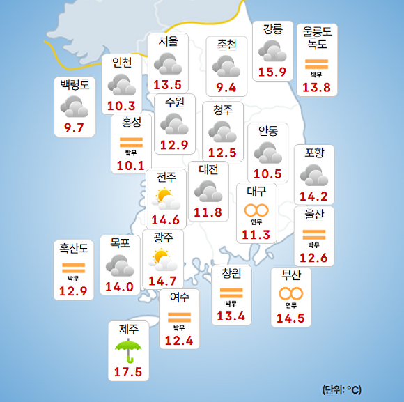 부산지방기상청에 따르면 이날 오전 9시 현재 주요 지역의 기온은 부산 14.5도, 울산 12.6도, 창원 13.4도로 기록됐다.
