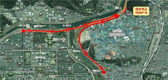 공사로 인한 통제구간은 한밭대로 진입부 ~ 원촌교 구간 및 문예지하차도(대덕대교) ~ 원촌육교 구간의 신탄진 방향 상행차로 전구간으로 30일(오후 6시)부터 4월 30일까지 전면 통제된다.