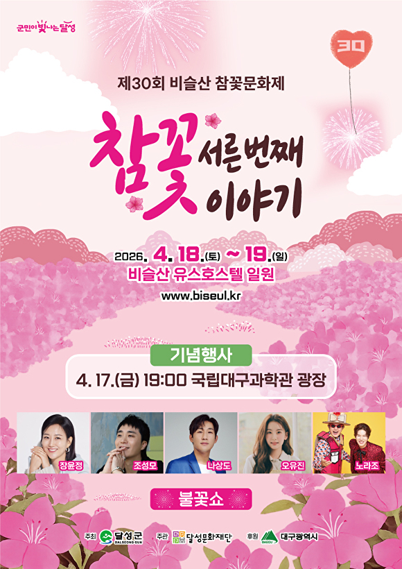 최재훈 달성군수는 “30주년을 맞은 참꽃문화제가 전국 대표 봄축제로 자리매김할 수 있도록 준비했다”며 “많은 방문객이 찾아 봄의 정취와 수준 높은 공연을 함께 즐기길 바란다”고 말했다.