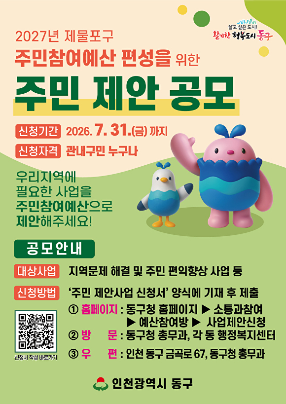 [아이뉴스24 장호찬 기자] 인천 동구(구청장 김찬진)는‘2027년 주민참여예산’제안 사업 공모를 오는 7월까지 진행한다고 밝혔다.