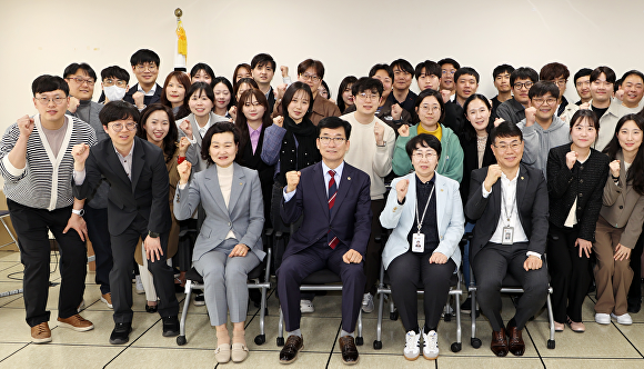 31일 ‘다채움’ 선도교원 발대식에 참석한 관계자들이 기념 촬영을 하고 있다. [사진=충북도교육청]