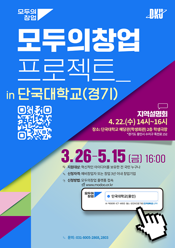 모집은 오는 5월 15일까지 이며 ‘모두의 창업’ 공식 홈페이지를 통해 온라인 신청이 가능하다. (사)한국창업보육협회가 주최하는 경기지역 설명회는 4월 22일 단국대 죽전캠퍼스 혜당관 학생극장에서 열릴 예정이다.