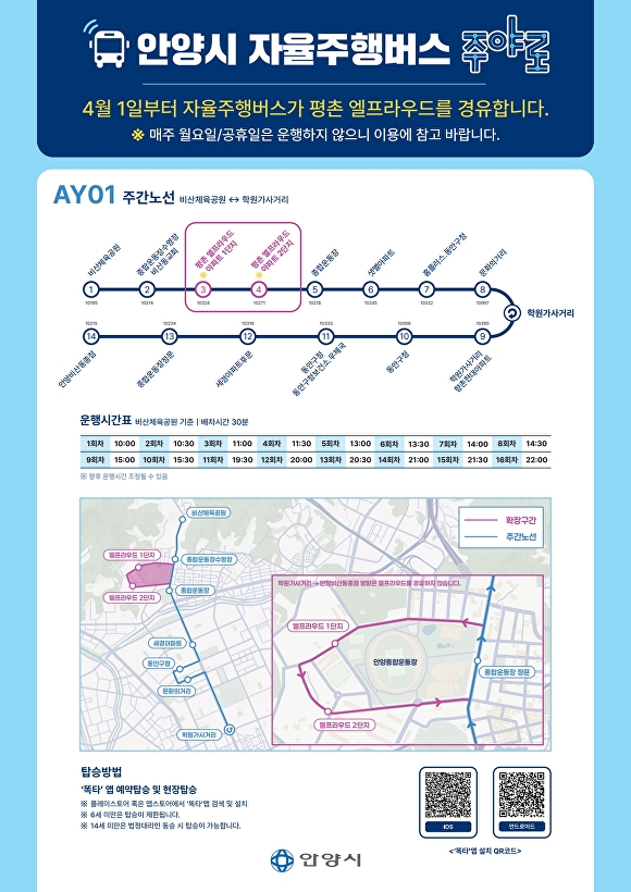 운행 노선도 일부 연장됐다. ‘주야로’는 평촌엘프라우드 아파트를 새롭게 경유해 1단지와 2단지에 각각 정차한다. 상행선(비산체육공원→학원가사거리 방면)은 종합운동장수영장·비산동교회 정류장을 거쳐 평촌엘프라우드 아파트 1, 2단지에 각각 추가 정차한다. 반면 하행선(학원가사거리→비산동 종점)은 기존과 동일하게 해당 아파트를 경유하지 않는다.