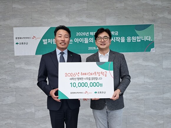 충청에너지서비스는 2일, 새 학기를 맞아 도내 취약계층 아동·청소년의 새로운 출발에 써달라며 ‘해피스타트 장학금’ 1000만원을 초록우산 충북지역본부(본부장 주경식)에 전달했다.