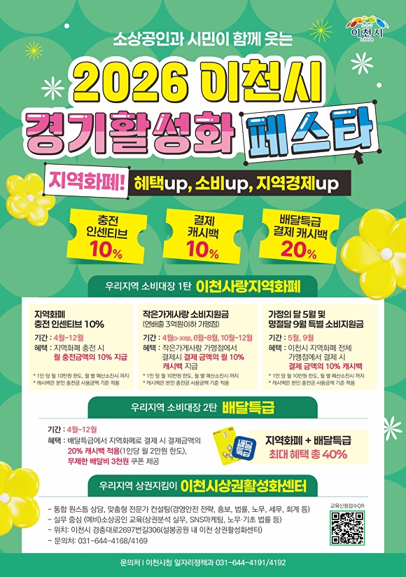 이번 사업은 올해 12월까지 연중 추진되며, 이천사랑 지역화폐를 충전 및 이용하는 시민 누구나 혜택을 받을 수 있다.