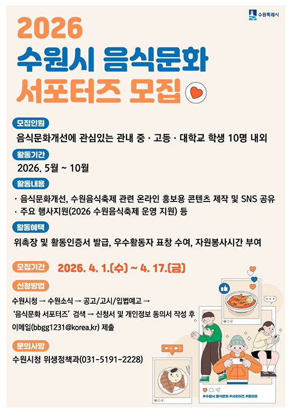 [아이뉴스24 김정수 기자] 경기도 수원특례시는 오는 17일까지 ‘2026년 음식문화 서포터즈’로 활동할 중·고등·대학생을 모집한다.