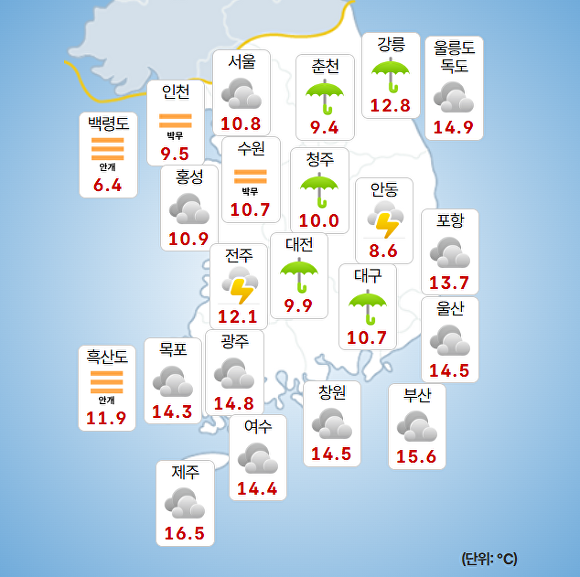 부산지방기상청에 따르면 이날 오전 9시 현재 주요 지역의 기온은 부산 15.6도, 울산 14.5도, 창원 14.5도로 기록됐다.