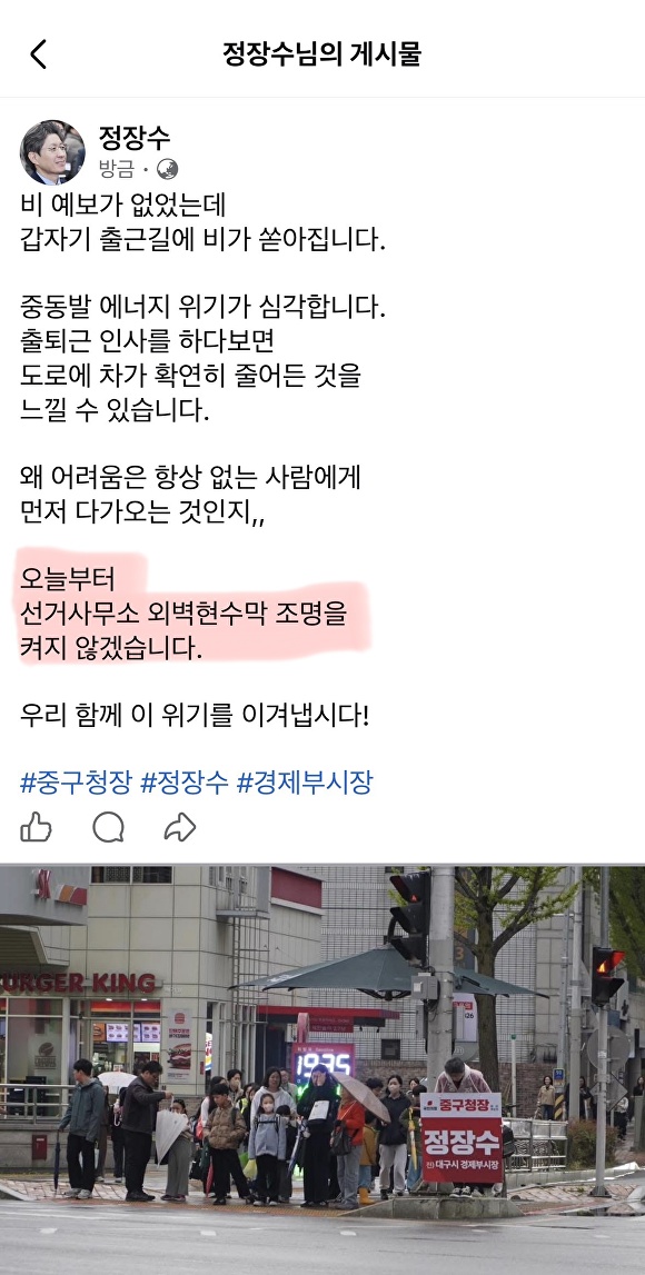 [아이뉴스24 이창재 기자] 정장수 대구 중구청장 예비후보가 중동발 에너지 위기를 언급하며 선거사무소 조명 사용을 중단하겠다고 밝혔다.