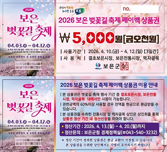 [아이뉴스24 소진섭 기자] 충북 보은군이 ‘2026 보은 벚꽃길 축제’를 맞아 지역 상권에 활력을 불어넣기 위한 전통시장 및 상권 활성화 페이백 이벤트를 한다고 6일 밝혔다.