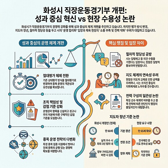 [아이뉴스24 이윤 기자] 경기도 화성시 직장운동경기부 운영을 둘러싸고 지도자 정년 연장 기준과 규칙 개정 절차를 둘러싼 논란이 확산되고 있다. 정년 연장 기준이 사전 협의 없이 통보됐다는 현장 반발이 제기되며 갈등이 이어지는 상황이다.