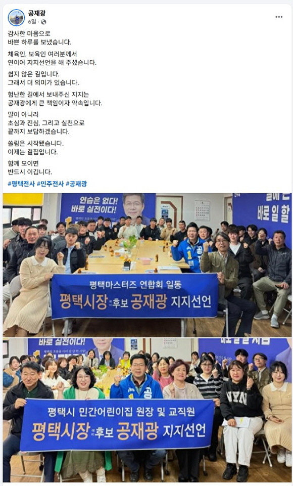 [아이뉴스24 임정규 기자] 제9회 전국동시지방선거를 앞두고 공재광 경기도 평택시장 예비후보가 허위 지지선언 논란에 휩싸이며 경찰에 고발되는 등 파장이 일고 있다.