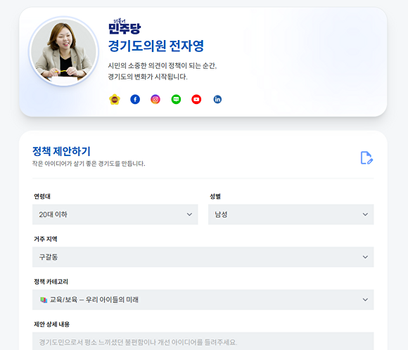 전 의원은 이번 플랫폼 개설을 통해 의정 활동의 투명성을 높이고 주민 참여의 문턱을 낮추겠다는 계획이다.