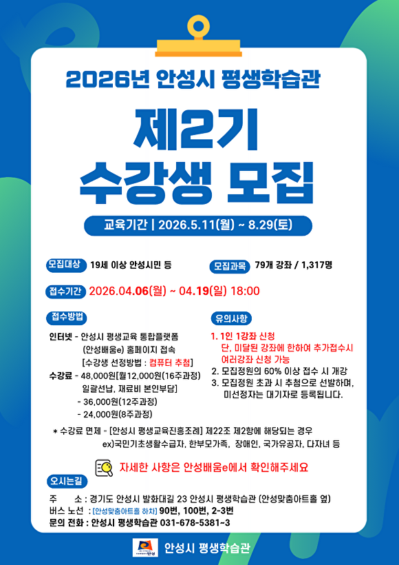 [아이뉴스24 임정규 기자] 경기도 안성시는 시민의 배움 기회를 확대하고 평생학습 참여를 활성화하기 위해 '2026년 평생학습관 제2기 프로그램' 수강생을 모집한다고 7일 밝혔다.