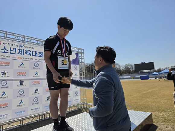 7일 진천교육지원청에 따르면 김도윤 학생은 증평종합운동장에서 열린 55회 충북소년체육대회 높이뛰기 종목에서 금메달을 차지했다.