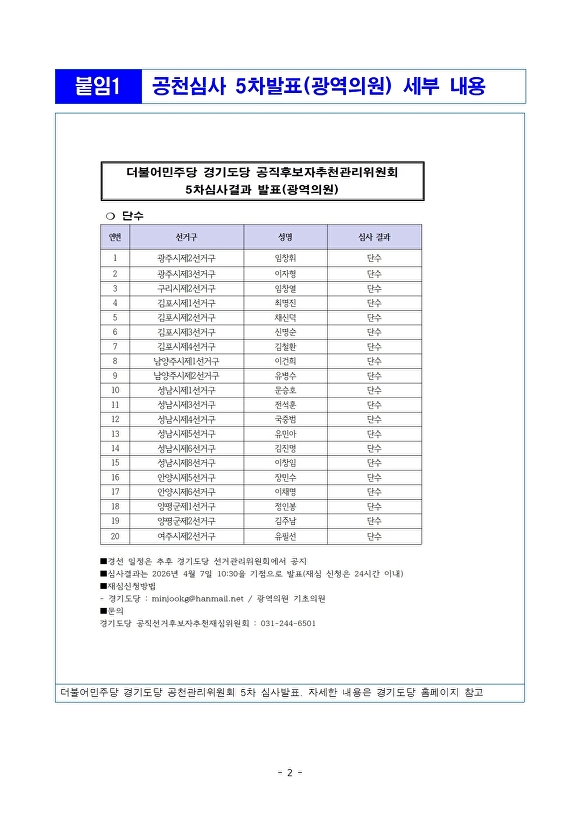 [아이뉴스24 김정수 기자] 더불어민주당 경기도당 공직선거후보자추천관리위원회(이하 공관위)는 7일 5차공천심사(광역의원) 결과를 발표했다.