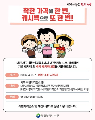 이에 서구 관내 착한가격업소(대전사랑카드 가맹점에 한함) 이용 고객이 대전사랑카드로 결제할 경우, 기존 혜택에 결제 금액의 3%를 더한 추가 캐시백을 받을 수 있다.